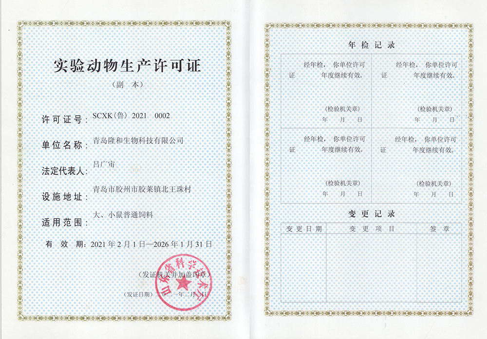 實驗(yan)動物(wu)生産(chan)許可(ke)證